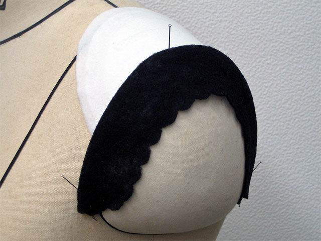 D待ち針で固定した部分はそのまま半返しで、マルで囲った部分は少々イセぎみにして半返しで袖付けの際に止め付けていきます。